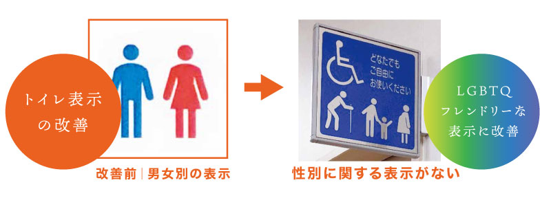 サインボードの「男女別表示」の代わりに、性別を指定しない「誰でもOK表示」が掲示されていること、通路から直接個室に入ることができると目線を気になりにくいこと。