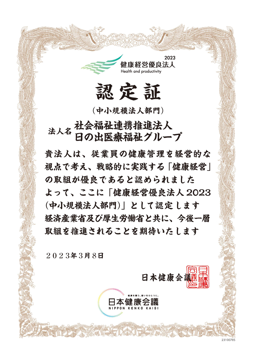 社会福祉連携推進法人 日の出医療福祉グループは引き続き、経済産業省が優良な健康経営を実践している法人を顕彰する「健康経営優良法人2023」に認定されました。