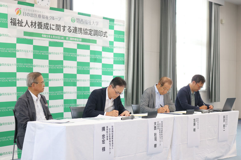 8月30日14:00より、関西福祉大学 加藤学長と社会福祉学部長 藤原様ご臨席のもと、調印式を行いました。