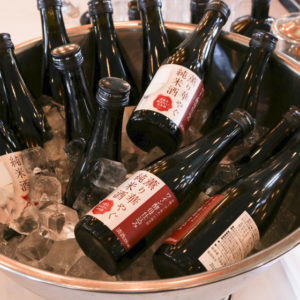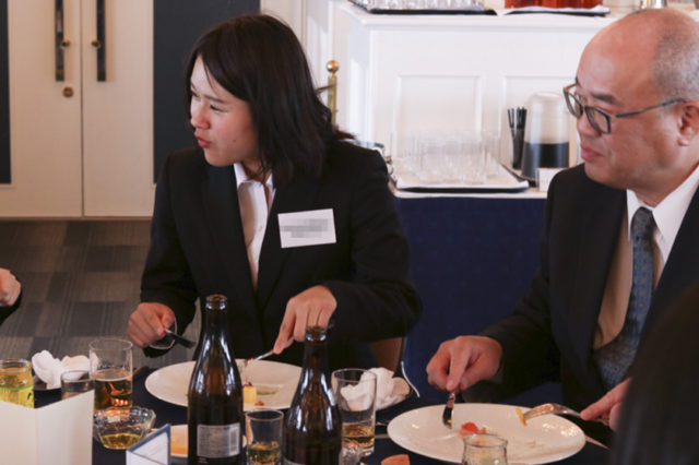 広々とした会場でそれぞれ指定された席に着席します。ここを同期の絆を作るきっかけとしてもらうべく、配属や職種を鑑みた座席配置に。また、各テーブルには日の出グループそれぞれの幹部が座り、新入社員と一緒に食事を楽しむのが恒例になっています。キング醸造が自社で製造しているお酒を提供してくださいました。