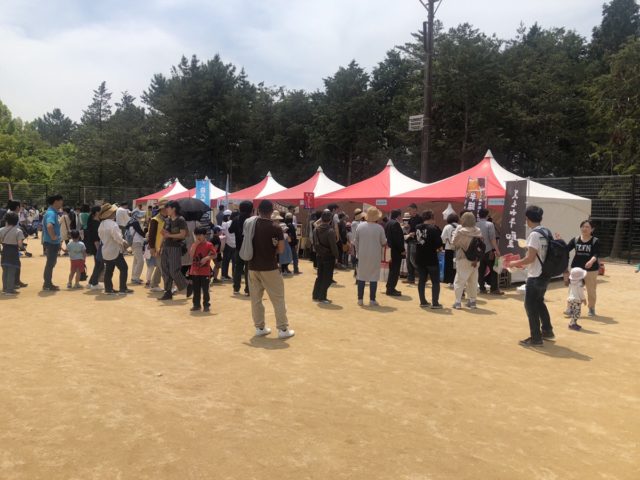 今年はGW真っ只中、天気は夏のように快晴!ということもあり、金曜日ですがたくさんのお客さんでにぎわっていました。祭り会場から駐車場への道筋にも、ご家族連れでお祭りから帰る人、これから参加される人が皆さん笑顔で歩いていました(^^)