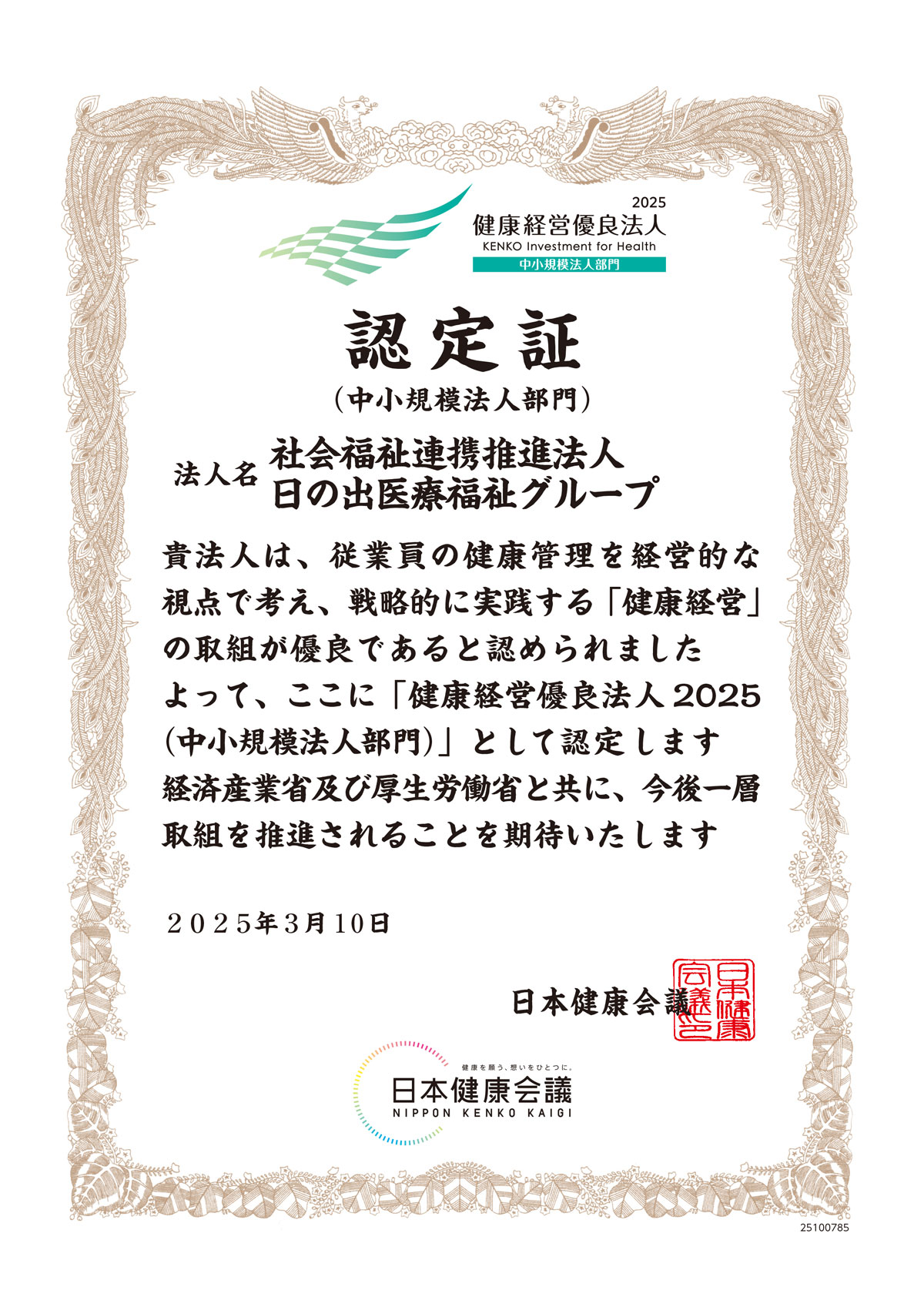 社会福祉連携推進法人 日の出医療福祉グループは引き続き、経済産業省が優良な健康経営を実践している法人を顕彰する「健康経営優良法人2025」に認定されました。