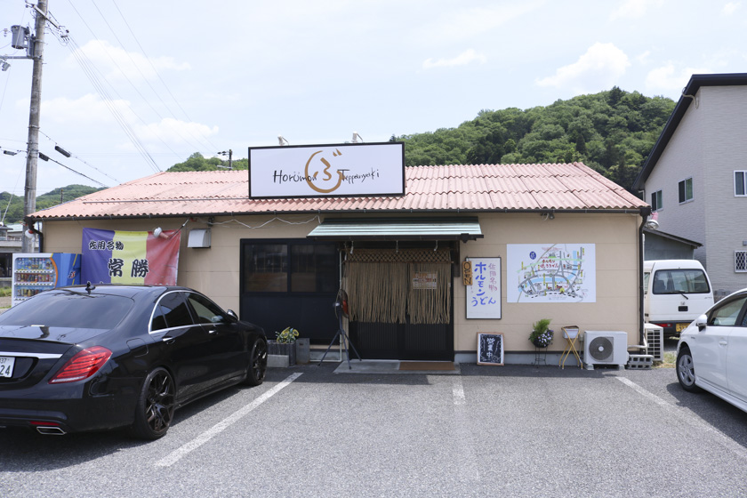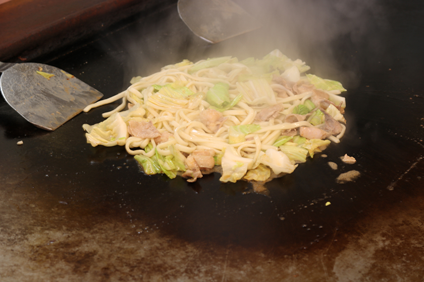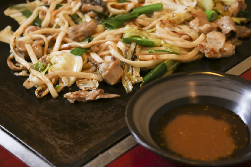 佐用名物「ホルモンうどん」は、牛ホルモン(ミノ・心臓・レバーなど)と野菜を炒め、うどんと出し汁を入れて焼き上げられたものが各テーブルの鉄板に運ばれます。お店ごとに異なるこだわりの「付けダレ」で食べるのが佐用流!