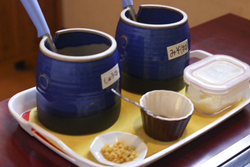 今回取材した「ふじ」さんでは味噌ダレと醤油ダレを好みで合わせた付けダレににんにく・七味・ゆずをこれまた好みで混ぜていただきました(^^)