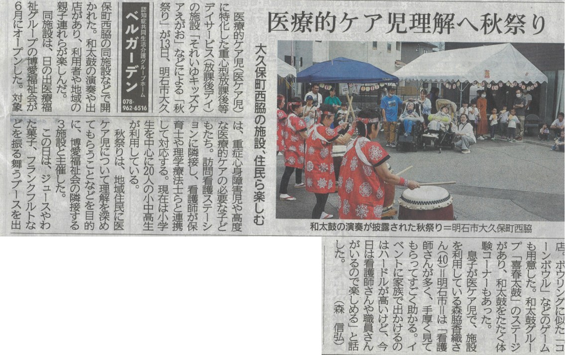 2025年10月15日(水)の神戸新聞朝刊(明石面)に、10月13日(月・祝)に、明石市の4事業所が合同で開催した「秋祭り」が掲載されました。